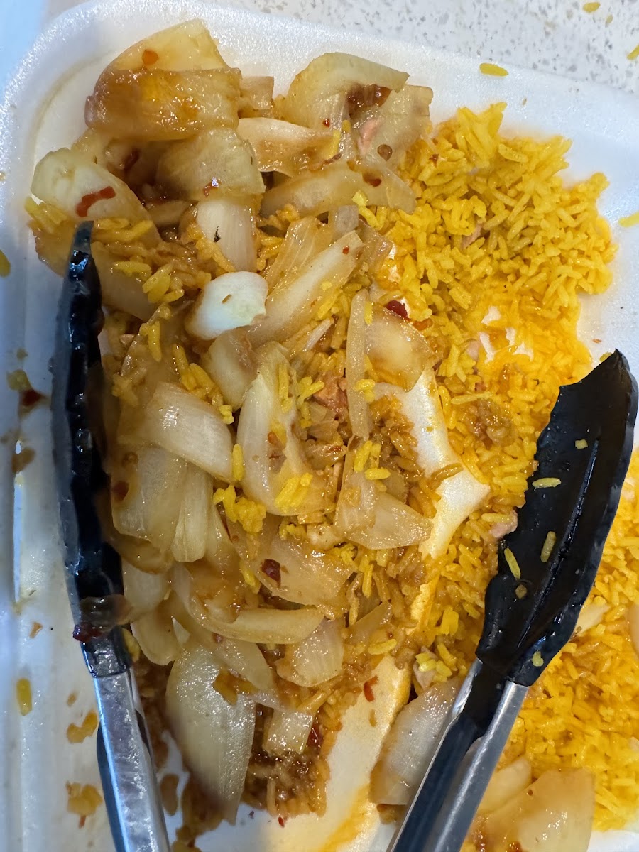 ................................US$10.75Broccoli, mushroom, cabbage, onion with yellow jasmine rice. Available in pt. or qt. size.